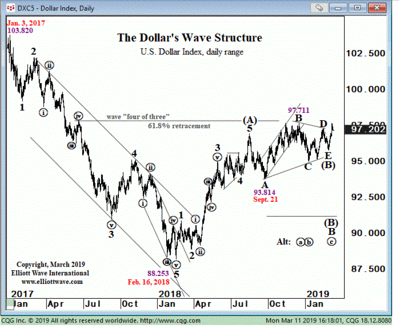 Chỉ số USD Index đang xuất hiện mẫu hình tam giác rào chắc (barrier triangle). Mẫu hình này sẽ còn tồn tại nếu như USD Index chưa phá thủng mốc 95.029. Vì vậy, đáy sóng E tại 95.74 của sóng (B) sẽ cực kỳ quan trọng.