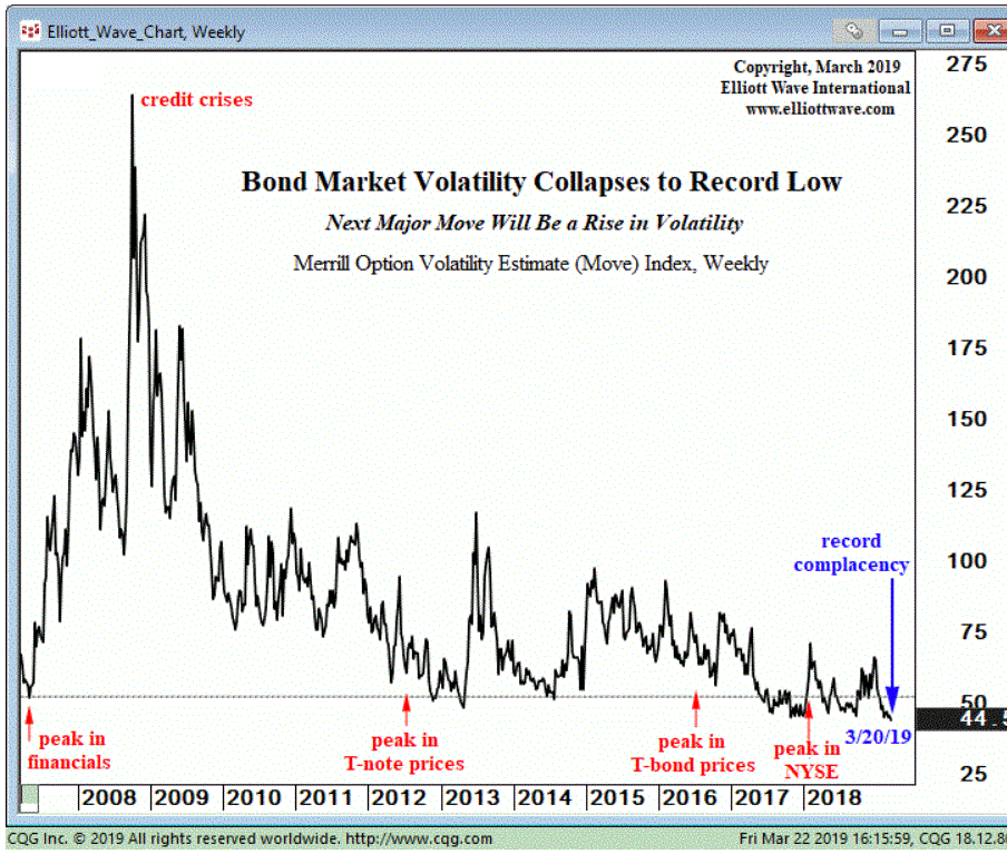 Trong khi đó, công ty EWI (Elliott wave international) cũng đưa ra những cảnh báo khá quan trọng. EWI nhắc lại thông điệp “Frenzy (điên cuồng)” của Bloomberg. Cú tăng mạnh của thị trường từ đầu năm 2019 đến nay đã khiến các nhà đầu tư tỏ rất hưng phấn. Chỉ số Merrill Lynch MOVE Index, một công cụ đo lường độ biến động trên thị trường trái phiếu hoạt động giống như chỉ số VIX trên thị trường chứng khoán, ghi nhận mức thấp kỷ lục vào ngày thứ 4 (20/3/2019). Biểu đồ dưới cho thấy nó có thể trùng với đỉnh của giá trái phiếu T-Note hoặc đỉnh của thị trường chứng khoán.