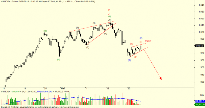 Vâng, VN-Index đã diễn ra theo kịch bản sóng chéo và tiến về mục tiêu giá 960 điểm. Anh Trần Văn Công tiếp tục chia sẻ quan điểm về việc đếm sóng như hình dưới. Theo đó, sóng (2) đang có dạng Zigzag. Khả năng sóng (2) sẽ bị kháng cự bởi gap và giảm điểm. Đây cũng có thể coi là mẫu hình cú nhảy của con mèo chết (Dead Cat Bounce).