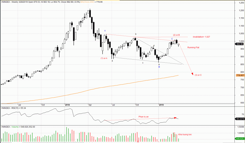 Trên đồ thị tuần, nên nhớ chúng ta vẫn đang có phân kỳ ẩn giảm giá giữa VN-Index với RSI.