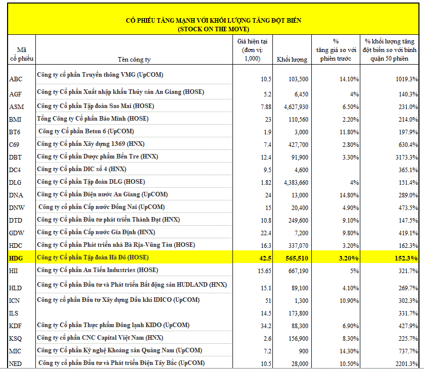 CÁC CỔ PHIẾU TĂNG GIÁ MẠNH VỚI KHỐI LƯỢNG ĐỘT BIẾN