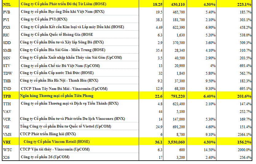 Danh sách theo dõi cổ phiếu STOCK ON THE MOVE (CÁC CỔ PHIẾU TĂNG GIÁ MẠNH VỚI KHỐI LƯỢNG ĐỘT BIẾN) hôm nay có 4 mã cổ phiếu cần chú ý: VRE, NTL, HDG và TPB (được bôi vàng).