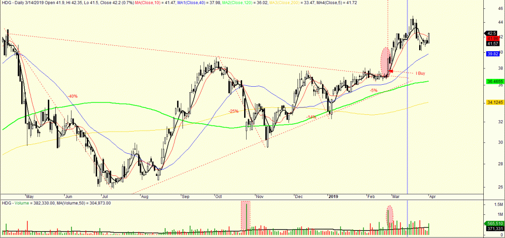 Cổ phiếu HDG đã mua ở giá 39 vào ngày 27/2/2019 sau khi tạo điểm phá vỡ thoát ra khỏi mẫu hình VCP (Độ Biến Động Thu Hẹp) và chốt lãi vào ngày 20/3/2019 khi đạt đủ mục tiêu tăng giá 20%. Chúng tôi không khuyến khích mở lại mua mới khi thị trường chung đang có dòng trạng thái “XU HƯỚNG TĂNG CÓ THỂ BỊ THAY ĐỔI”.