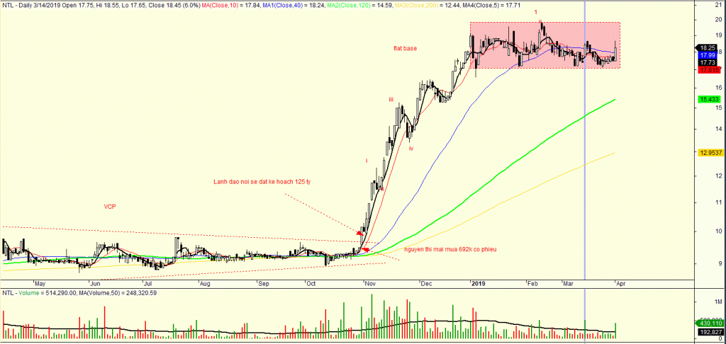 NTL vẫn đang vận động trong nền giá phẳng (Flat base). NTL cần điểm phá vỡ trên 20 với khối lượng tăng đột biến.