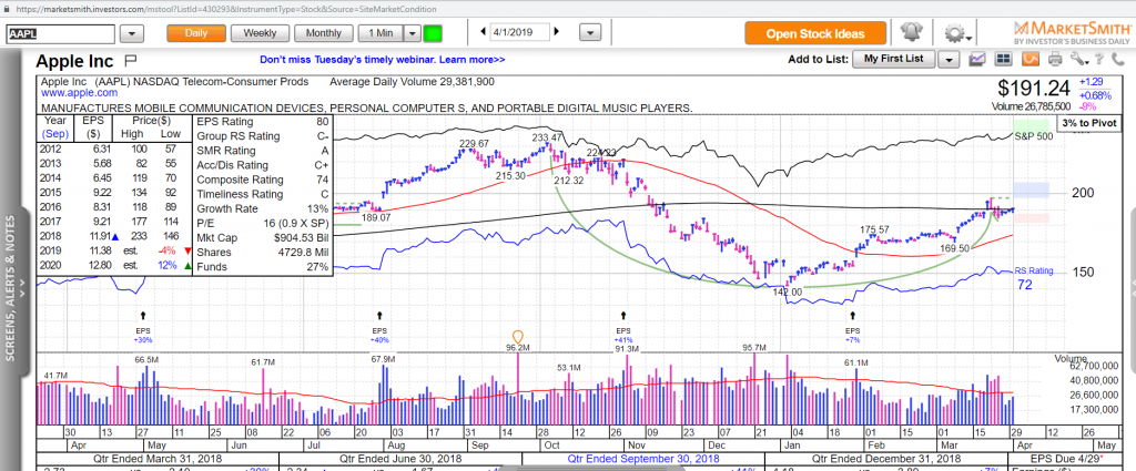 Nhiều cổ phiếu dẫn dắt của mình đang ở gần điểm mua. Ví dụ như Apple đang ở gần điểm pivot của mẫu hình chiếc cốc-tay cầm.