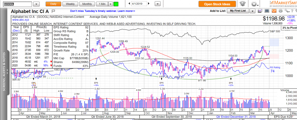 Hay Google đang ở gần điểm pivot của mẫu hình chiếc cốc-tay cầm. Nền giá 1. Điểm pivot $1236.44. Chiều dài mẫu hình là 170 ngày. Độ sâu chiếc cốc là 24%. Độ sâu tay cầm là 6%.