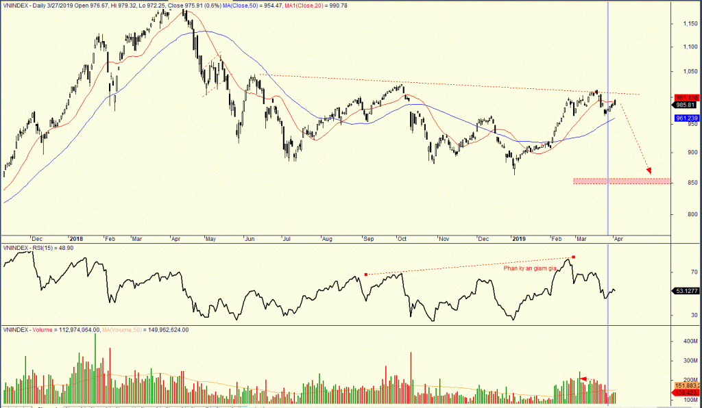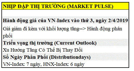 Các chỉ số chứng khoán Việt Nam có hành động giá phân phối vào phiên giao dịch ngày 2/4/2019 (thứ 3) khi các chỉ số giảm điểm trong khi khối lượng tăng cao hơn ngày hôm trước. Cụ thể, chỉ số VN-Index đóng cửa 985.81, giảm 0.28% trong khi chỉ số HNX-Index đóng cửa 107.48, tương ứng giảm -0.22%.
