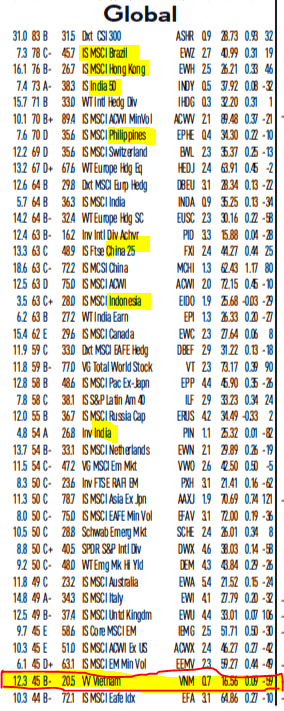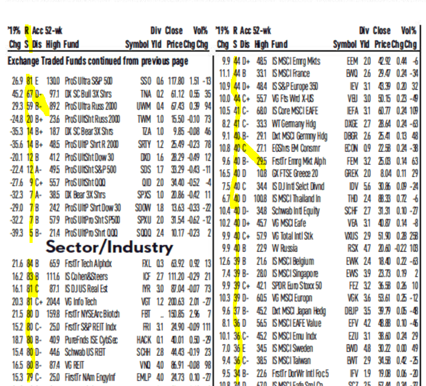 Nhật Báo IBD cung cấp danh sách 350 quỹ ETF đi kèm với khối lượng giao dịch bình quân 50 ngày và phân loại lĩnh vực hoạt động như: đầu tư chỉ số chứng khoán Mỹ, Lĩnh Vực/Ngành, Toàn Cầu, Trái Phiếu, Hàng Hóa Và Tiền Tệ. Mỗi nhóm phân loại đều có xếp hạng RS với thứ tự từ cao đến thấp. Xếp hạng ETF dựa trên xếp hạng RS cho biết quỹ ETF nào đang là quỹ dẫn dắt trong mỗi nhóm phân loại và giúp bạn so sánh chúng với nhau. Bảng này cũng đề cập đến tỷ suất sinh lợi từ đầu năm đến ngày hiện tại của mỗi quỹ. Xếp Hạng Phân Phối/Tích Lũy, lợi suất cổ tức, và giá đóng cửa ngày hôm trước, phần trăm thay đổi giá, phần trăm thay đổi khối lượng so với khối lượng giao dịch bình quân.