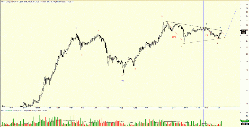 Ngành thủy sản đang là nhóm ngành dẫn sóng và các cổ phiếu tăng trưởng có thể xuất hiện ở đây. Tôi đang theo dõi cổ phiếu ANV với mô hình sóng tam giác (triangle) đang hình thành. Đây cũng được xem là mẫu hình VCP(Độ Biến Động Thu Hẹp). Lần thu hẹp đầu tiên là 25%, lần thứ hai đang là 12%. Nếu lần thứ ba mức giảm tầm quanh 6%-8%, tôi đánh giá cao khả năng hình thành mẫu hình VCP. Khối lượng giao dịch sụt giảm khi mẫu hình VCP đang hình thành. Lưu ý, mẫu hình chỉ hoàn tất khi có điểm phá vỡ (breakout), ở đây, nhà giao dịch chỉ đang làm bài tập về nhà và theo dõi các cổ phiếu tăng trưởng.