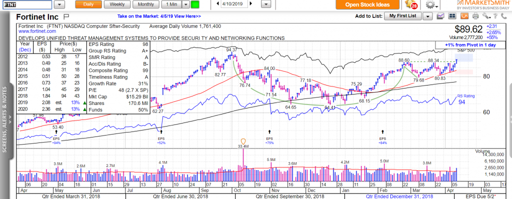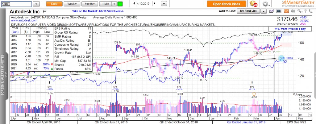 Một số cổ phiếu vừa mới tạo điểm phá vỡ vượt lên trên điểm pivot ngày hôm nay như Autodesk (ADSK) từ nền giá phẳng (Flat base). Trong khi đó cổ phiếu Fortinet Inc (FTNT) có điểm phá vỡ từ mẫu hình chiếc cốc-tay cầm.. Đây đều là các cổ phiếu phần mềm thuộc lĩnh vực công nghệ.