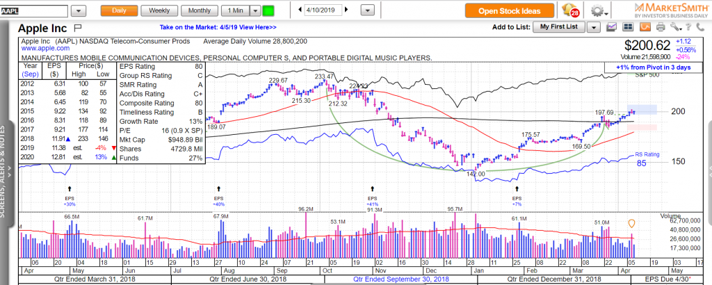 Cổ phiếu lớn như Apple đã xuất hiện điểm mua cách đây 3 ngày và mới tăng 1% từ điểm pivot. Mẫu hình của Apple là chiếc cốc-tay cầm.