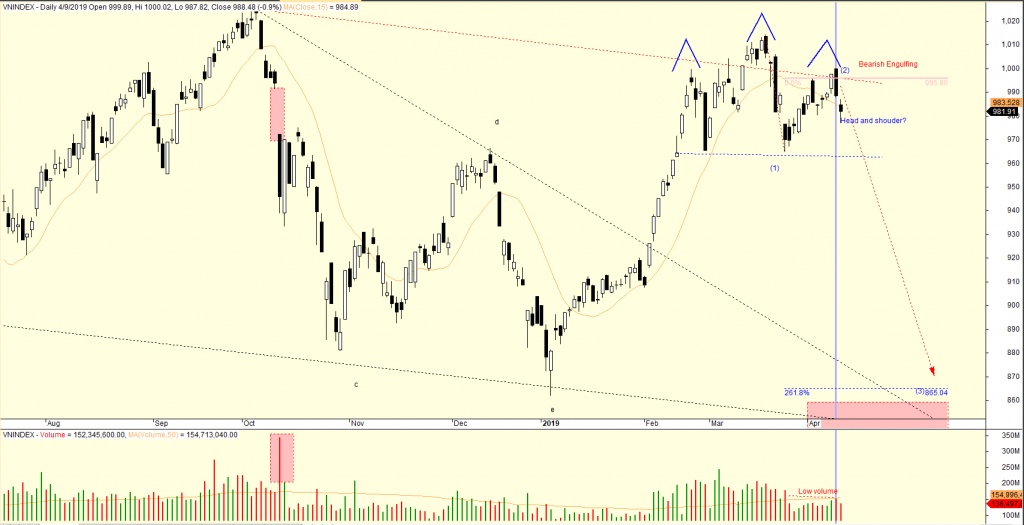 Diễn biến của VN-Index khiến tôi vẫn theo dõi kịch bản mẫu hình VAI ĐẦU VAI. Mẫu hình nền Bearish Engulfing xuất hiện ở phiên ngày thứ 3 vẫn đang tạo tín hiệu tiêu cực. Triển vọng thị trường là: “THỊ TRƯỜNG ĐANG Ở TRONG XU HƯỚNG GIẢM” với 7 ngày phân phối ở VN-Index.