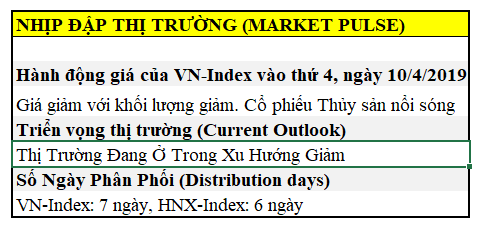 Hộp nhịp đập thị trường của IBD vào ngày 10/4/2019 vẫn xác định triển vọng thị trường là: “XU HƯỚNG TĂNG ĐƯỢC XÁC NHẬN (CONFIRMED UPTREND). Số ngày phân phối được giảm xuống khi thời gian 5 tuần trôi qua. Hiện tại số ngày phân phối của Nasdaq và S&P500 đang là 4.