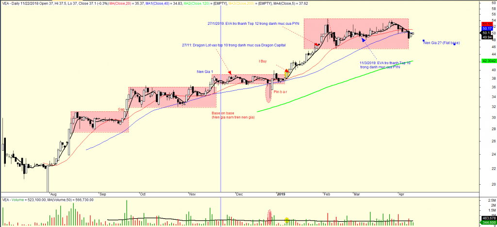 VEA vẫn đang xây nền giá phẳng (FLat base). Mẫu hình đã kéo dài 8 tuần với khối lượng thấp cho thấy nền giá vẫn đang hình thành tốt.
