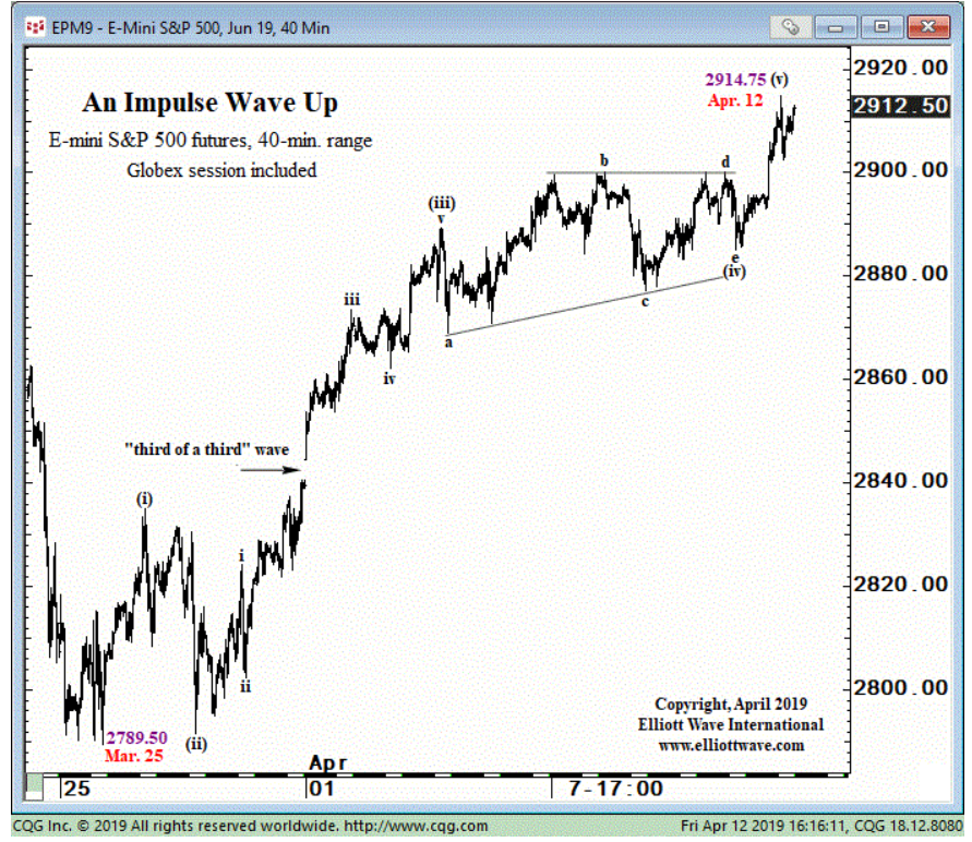 Phân tích sóng Elliott trên khung thời gian 40 phút cho thấy S&P500 đang ở sóng tăng (v) sau khi sóng (iv) có dạng tam giác (triangle). Nói cách khác, đợt tăng giá từ đáy ngày 25/3 đến nay (12/4) đang có đủ năm sóng.