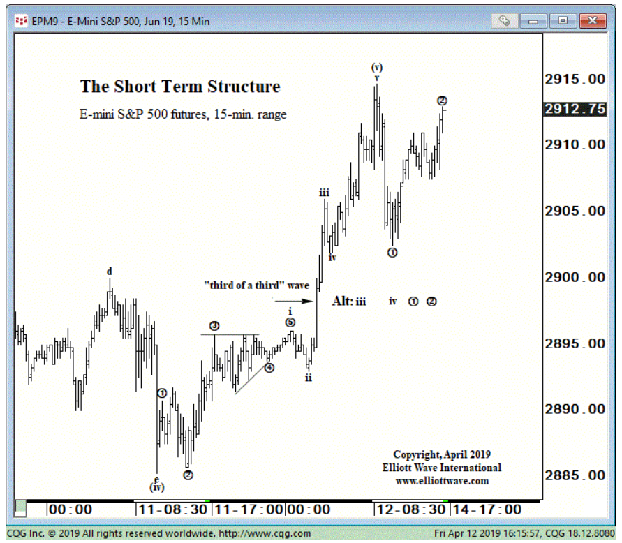 Trên khung thời gian 15 phút, tôi đang nhìn thấy sóng (v) có đầy đủ năm sóng nhỏ hơn bên trong. Nếu giá phá thủng mức 2,900, khả năng SP500 sẽ điều chỉnh về 2885 hoặc sâu hơn.