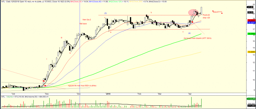 Ngày 12/4/2019, NTL hoàn thành TƯ THẾ SQUAT VÀ BẬT DẬY. Với vùng giá mua hợp lý là 20-21, các nhà đầu tư có thể đặt lệnh dừng lỗ ở 18-19. Cá nhân tôi nâng lên 20 cho lần nhồi lệnh thứ ba ở giá 21.