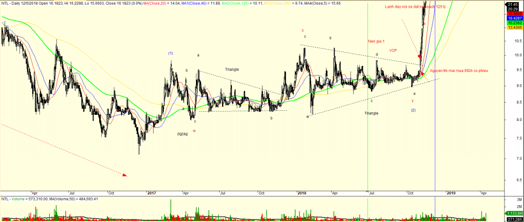 Trên đồ thị, NTL đã hình thành Hình Mẫu Xu Hướng (Trend Template) với đường MA200 ngày dốc lên ít nhất trong 5 tháng. Ngày 2/4/2019, NTL tăng trần với đột biến khối lượng lớn bên trong nền giá phẳng (flat base), thu hút các nhà đầu tư thông minh dưa trên kế hoạch kinh doanh lạc quan năm 2019. Đây là nền giá số 2.