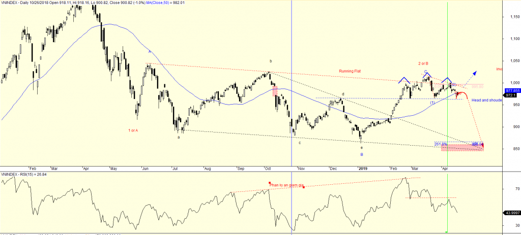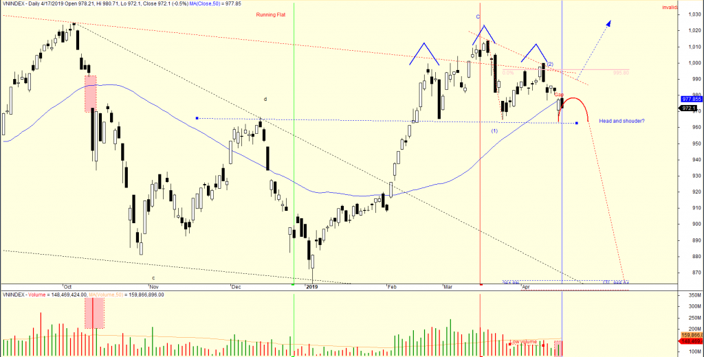 Phiên ngày 17/4/2019 là một ngày phân phối với khối lượng giao dịch tăng mạnh hơn ngày hôm trước và giá giảm. Theo đó, VN-Index giảm 0.5% và đóng cửa ở mức 972 điểm. Như vậy, chỉ số này đã thất bại trong việc giữ MA50 ngày. Tuy nhiên, mốc hỗ trợ và thiết lập tín hiệu bán vẫn là 965 điểm. Thủng mức giá này, mẫu hình vai-đầu-vai chính thức hoàn thành. Lúc này, câu chuyên tiên đoán 1,000 điểm của Shark Nguyễn Duy Hưng vào đầu năm 2019 là “hoàn toàn có thật”.