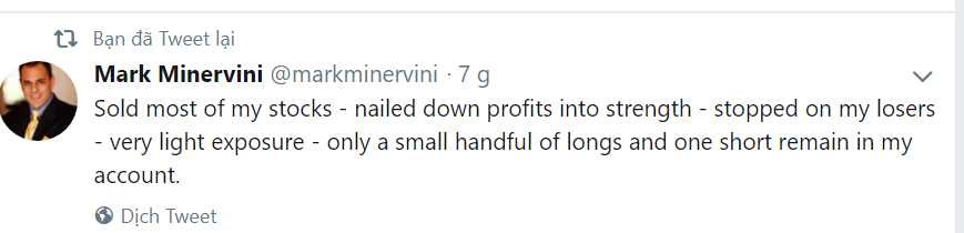 Phù thủy chứng khoán Mark Mivervini cũng đăng những dòng twiter kêu gọi chốt lãi ở thị trường chứng Mỹ: “Tôi bán phần lớn các cổ phiếu của mình, chốt lãi khi giá cổ phiếu còn tăng mạnh và chấp nhận các khoản lỗ nhỏ. Mức độ hiện diện rủi ro của tôi là rất nhỏ.”