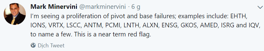 “Tôi đang nhìn thấy sự thất bại của các điểm mua pivot và các nền giá thất bại. Ví dụ như EHTH, IONS, VRTX, LSCC, ANTM, PCMI, LNTH, ALXN, ENSG, GKOS, AMED, ISRG, và IQV cùng một vài cái tên nữa. Đây là dấu hiệu của cảnh nguy hiểm.”