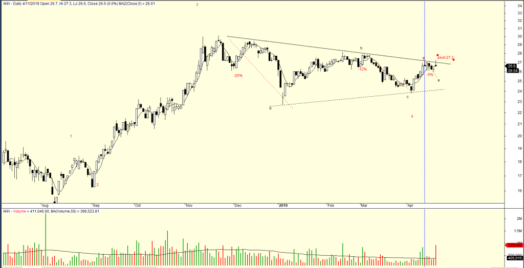Cổ phiếu ANV vẫn chưa thể hoàn tất mẫu hình VCP (độ biến động thu hẹp) hoặc mẫu hình tam giác. Mặc dù báo cáo lợi nhuận quý 1/2019 cho thấy mức tăng đột biến 2.6 lần so với cùng kỳ nhưng giá lại giảm khi đối diện với mức pivot 27.3. Đi kèm với đó là thanh khoản lớn. Vì vậy, ANV có thể tiếp tục giảm để hình thành sóng e.