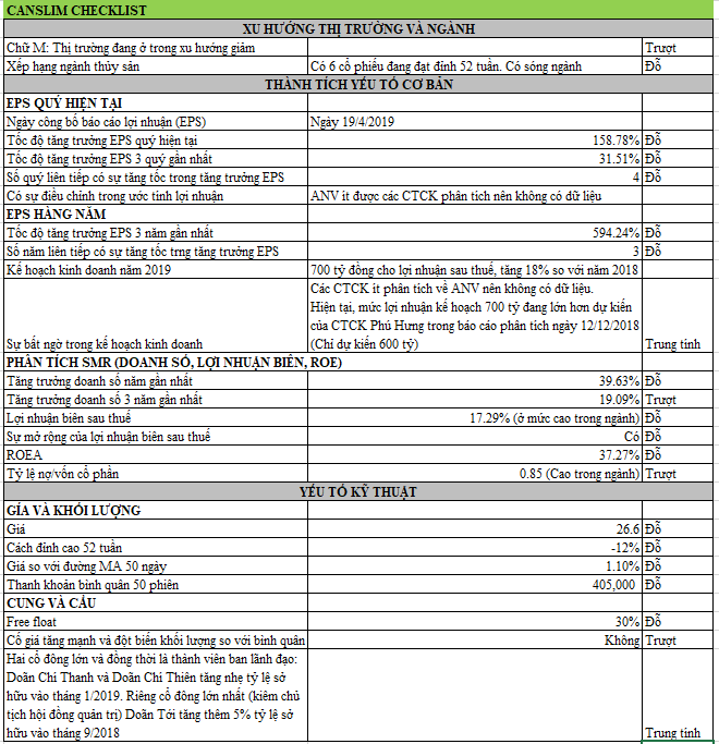 ANV gần như đỗ các tiêu chí quan trọng của bảng đánh giá CANSLIM checklist. Trong đó, tăng trưởng EPS quý hiện tại lên tới 158%, có 4 quý liên tiếp xảy ra sự tăng tốc trong tăng trưởng EPS. Tốc độ tăng trưởng EPS 3 năm gần nhất lên tới gần 6 lần. ROE cao 37% và lợi nhuận biên của doanh nghiệp ngày càng mở rộng. Cổ phiếu thuộc loại cô đặc với thanh khoản khá cao.
