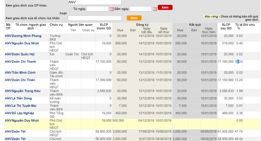 Điều chúng ta đang cần là một chất xúc tác. Các cổ đông lớn chưa mua vào mạnh mẽ cổ phiếu ANV trong 3 quý gần nhất. Hai cổ đông lớn là ông Doãn Chi Thanh và Doãn Chí Thiên chỉ đặt mua nhẹ vài chục nghìn cổ phiếu. Riêng Chủ Tịch Hội Đồng Quản Trị và cũng là cổ đông lớn nhất Doãn Tới, tuy tăng 5% tỷ lệ sở hữu nhưng lại xảy ra vào thời điểm tháng 8-tháng 9.2018, tức vượt ra ngoài khung thời gian quan sát 3 tháng. Tuy nhiên, nó vẫn nằm trong khung thời gian đánh giá khác là 3 quý. Vì vậy, tôi đánh giá tiêu chí này ở mức trung tính.