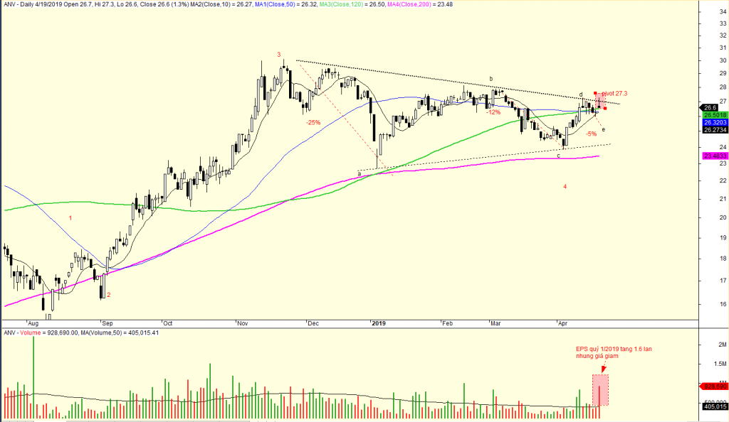 Diễn biến trên đồ thị ngày 19/4/2019, thời điểm công bố báo cáo kinh doanh quý 1/2019 cho thấy ANV giảm giá với thanh khoản lớn bất thường mặc dù EPS quý 1 tăng gấp 1.6 lần. ANV đang thất bại đúng tại mức giá pivot 27.3. Điều này cho thấy ANV có khả năng giảm điểm trong vài phiên tới. Bạn nên theo dõi trong thời gian 1 tháng sau khi có báo cáo lợi nhuận đột biến để tìm kiếm cơ hội mua.