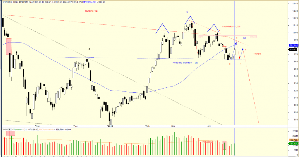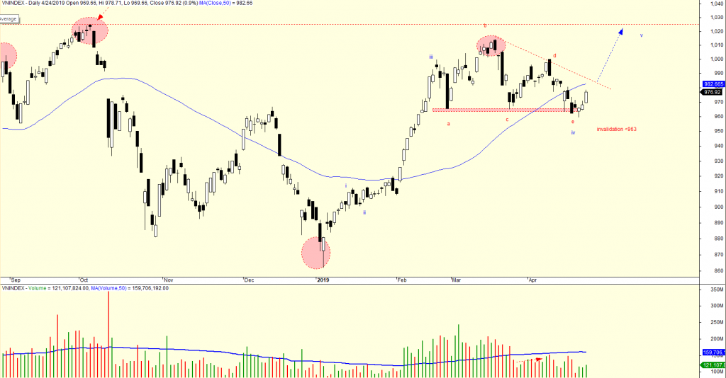 Diễn biến thị trường hiện nay đúng như tôi kỳ vọng: Có một bulltrap nhẹ. Theo kịch bản này, VN-Index có kháng cự quanh 980-990 điểm. Nếu VN-Index thất bại tại ngưỡng kháng cự này. Khả năng điều chỉnh theo sóng d và sóng e như hình hoàn toàn có khả năng xảy ra.