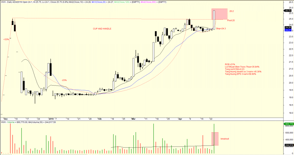 Phiên hôm nay xuất hiện điểm breakout của cổ phiếu HVH từ mẫu hình chiếc cốc-tay cầm. Đây là cổ phiếu mới lên sàn và Chiếc Cốc-Tay Cầm là nền giá đầu tiên của HVH.