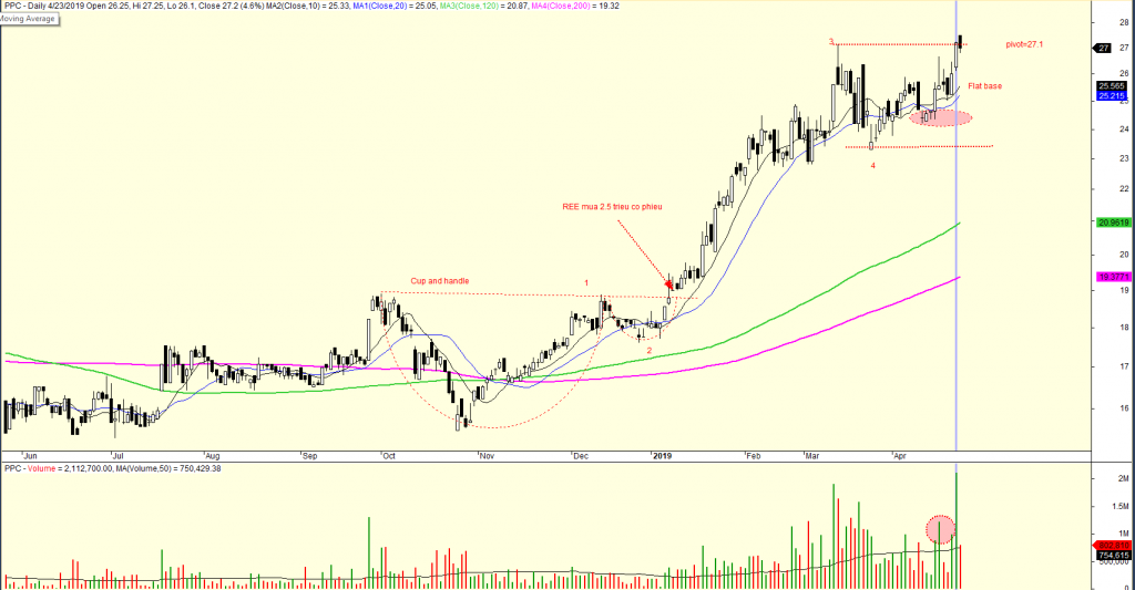 Cổ phiếu PPC chưa vượt qua được điểm pivot 27.1. Trader tiếp tục quan sát khả năng breakout để bổ sung thêm vị thế. (Trước đó đã add bổ sung ở 26-26.2 theo chiến lược: “GIÁ KÉO NGƯỢC VÀ NẢY LÊN TỪ ĐƯỜNG TRUNG BÌNH DI ĐỘNG 50 NGÀY”).