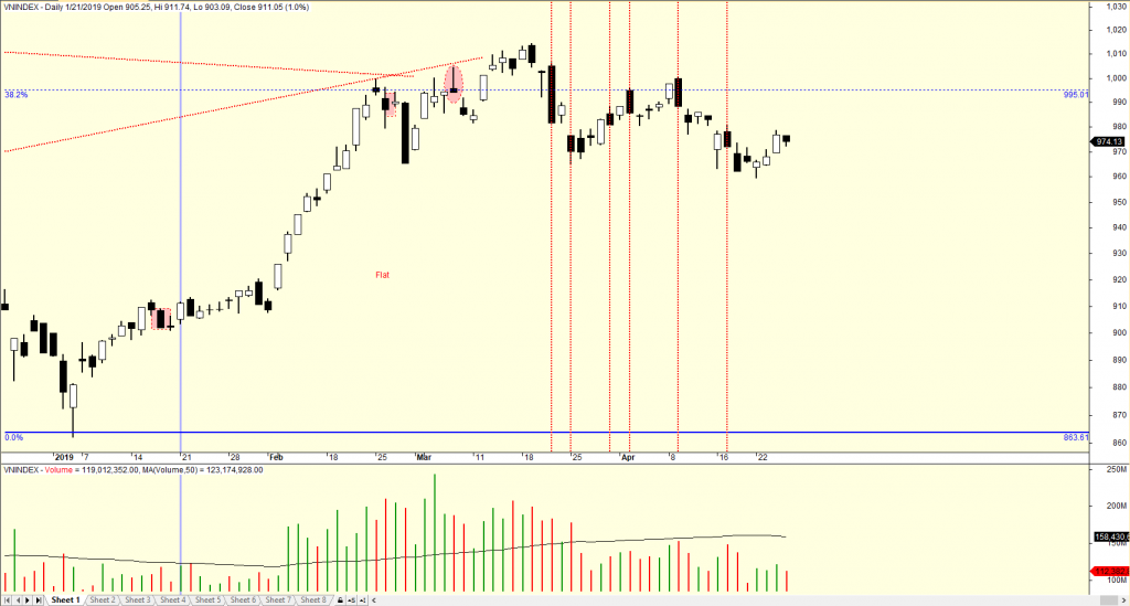 Trong hình em vẽ và thực tế của Việt Nam, chỉ số VN-INdex có ngày bùng nổ theo đà vào ngày 9/1/2019 và chúng ta bắt đầu tìm kiếm số ngày phân phối. Tương ứng với số ngày phân phối, chúng ta có những hành động như sau.