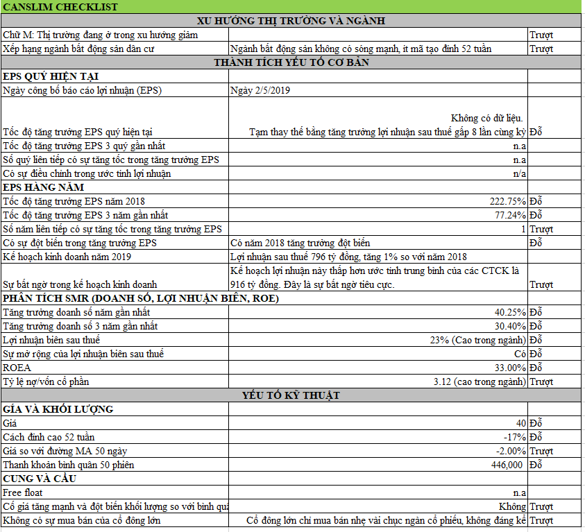 Bảng đánh giá CANSLIM cho thấy, các tiêu chí khả năng sinh lợi và tăng trưởng của HDG là rất tốt (đỗ). Tuy nhiên, vấn đề là công ty đang có sự bất ngờ tiêu cực trong kế hoạch kinh doanh 2019. HDG chỉ đạt kế hoạch 796 tỷ đồng, trong khi các CTCK đang dự phóng mức lợi nhuận 916 tỷ đồng.