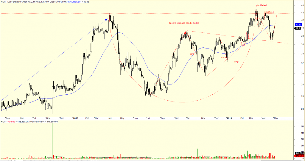 Tuy nhiên, HDG lại không có sự xác nhận bởi hành động giá. Trên đồ thị, HDG đang có nền giá thứ 3 với dạng Chiếc Cốc-Tay Cầm bị thất bại. Hiện tại giá đã phá thủng đường MA50 ngày với khối lượng lớn. Vì vậy, chúng tôi loại bỏ HDG ra khỏi danh sách theo dõi dù kết quả kinh doanh quý 1 rất ấn tượng.