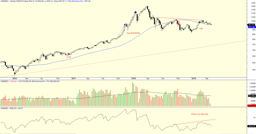 Lý do khiến VN-Index giảm giá là sự phân kỳ ẩn giảm giá giữa RSI và VN-Index trên đồ thị Weekly
