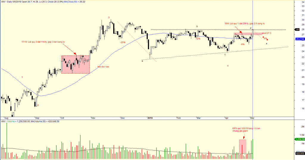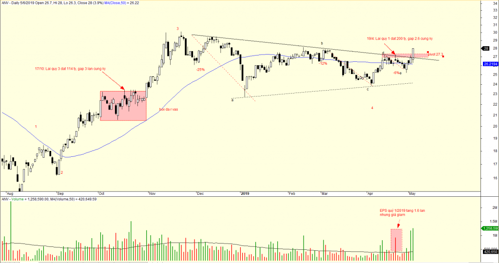 Cổ phiếu ANV trở thành tâm điểm đáng chú ý của phiên hôm nay khi nhà đầu tư dự kiến nó sẽ trở thành “kẻ hưởng lợi” trong trade war. ANV tạo điểm phá vỡ, vượt qua pivot, và có khối lượng giao dịch tăng đột biến 1.2 triệu cổ phiếu.
