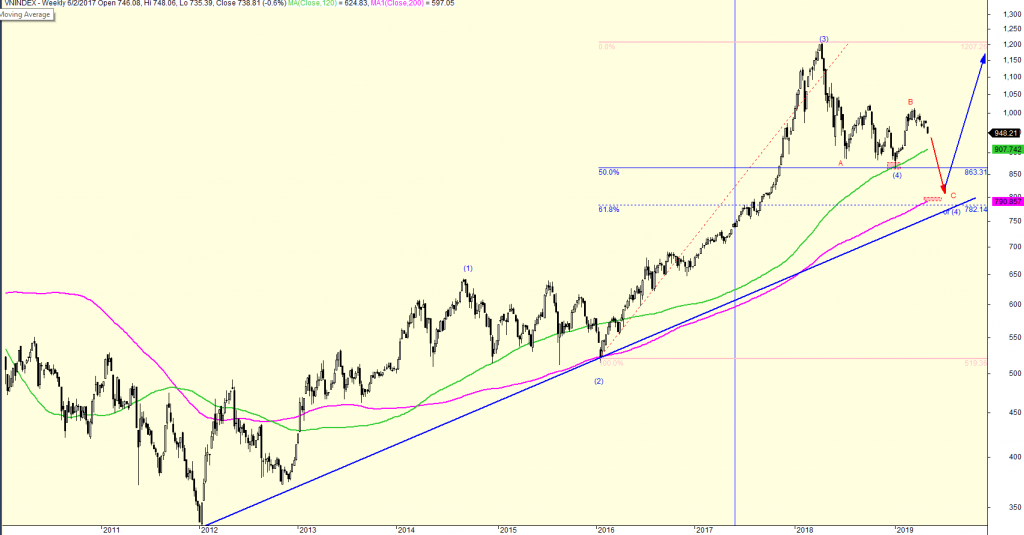 Trên đồ thị, kịch bản chính hiện nay của tôi là sóng (4) kết thúc ở 890 vào tháng 1.2019 với MA120 tuần và Fibonacci 50% là hỗ trợ. NHƯNG BẠN NÊN BIẾT RẰNG, NGAY CẢ KHI VN-INDEX ĐỔ DỐC VỀ 780-800 ĐIỂM CŨNG KHÔNG LÀM CHO TREND TĂNG BỊ GÃY. ĐÓ LÀ NƠI CÓ SỰ HỘI TỤ CỦA FIBONACC 61.8%, MA200 TUẦN VÀ ĐƯỜNG TRENDLINE TĂNG KHỞI ĐẦU TỪ THÁNG 1.2012.