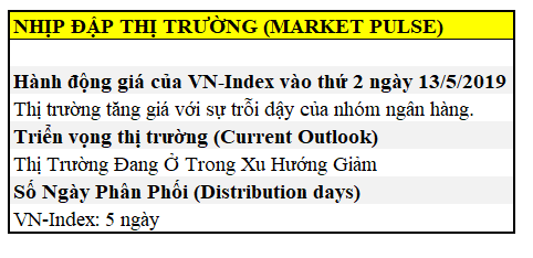 Tính từ đáy thấp nhất vào ngày 9.5.2019, chúng ta đang ở ngày thứ 2. Ngày BÙNG NỔ THEO ĐÀ thường xuất hiện từ phiên thứ 4 đến thứ 7. Đây là điều các nhà đầu tư cần quan sát. Một khi chưa có ngày bùng nổ theo đà, hộp Nhịp Đập THị Trường vẫn đang trong tình trạng “THỊ TRƯỜNG ĐANG Ở TRONG XU HƯỚNG GIẢM”