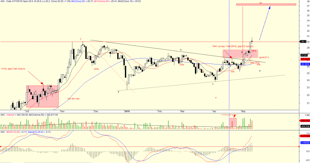 Dòng thủy sản đang có dấu hiệu chốt lời. ANV mất đà tăng trong thời gian giao dịch buổi chiều. Tuy nhiên, tôi vẫn đang đánh giá tích cực cổ phiếu này khi thanh khoản phiên hôm nay của ANV thấp hơn phiên trước và cây nến Doji thể hiện sự lưỡng lự của nhà đầu tư. Trong một xu hướng tăng giá, việc cổ phiếu nghỉ ngơi vài phiên là điều bình thường. MACD Histogram đang thiết lập đỉnh cao nhất 3 tháng cho thấy tiềm năng tăng giá của ANV.