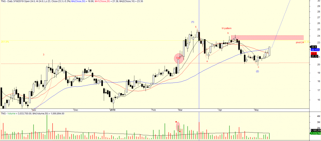 Trên đồ thị của TNG, khả năng mẫu hình Hai Đáy (W) đang hình thành. Nền giá này đã hình thành trong 10 tuần, độ sâu 15% và điểm pivot là 24.2, Mức giá hiện tại của TNG đang là 22.4.
