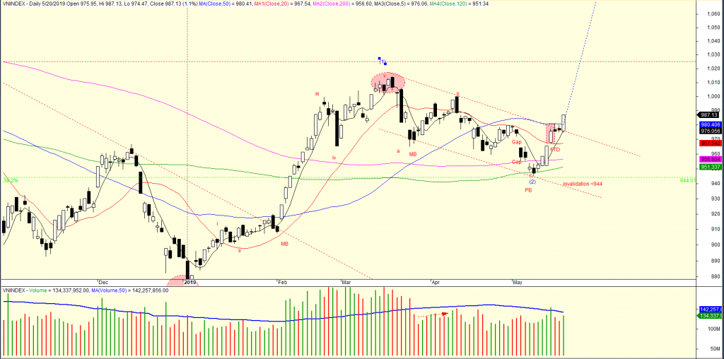 Việc chỉ số VN-Index vượt qua MA50 ngày (tại vùng 980-982 điểm) đã xác nhận kịch bản tăng giá mà tôi gọi là “Gió Đông” trong các bài viết trước. Mục tiêu của sóng 3 là 1,200 điểm, tức đỉnh cũ đã bị mất vào tháng 4 năm ngoái.