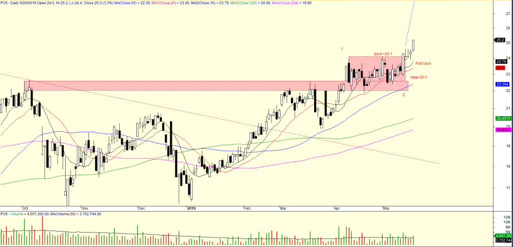 Đúng như kỳ vọng, cổ phiếu PVS đã tăng giá mạnh trong phiên đầu tuần sau khi có điểm breakout từ nền giá phẳng (flat base). Giá đóng cửa nằm ở đỉnh cao nhất trong ngày cho thấy lực tăng còn mạnh.