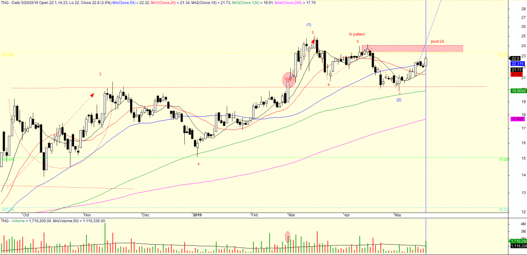 Nếu các bạn đã bị bỏ lỡ cơ hội mua ở các cổ phiếu tôi đề cập ở trên, hãy tiếp tục quan sát các cổ phiếu đang tiến sát điểm Pivot như TNG. ĐIểm pivot là 24.2 trong khi giá hiện tại là 22.8. Mẫu hình ở đây là Hai Đáy (W)