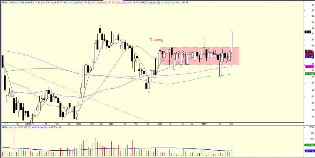 Điểm nhấn khác trong phiên giao dịch ngày hôm nay là cổ phiếu MSN. Cổ phiếu này đã tạo điểm phá vỡ theo mô hình 3-C như chúng tôi đề cập trong bài viết trước
