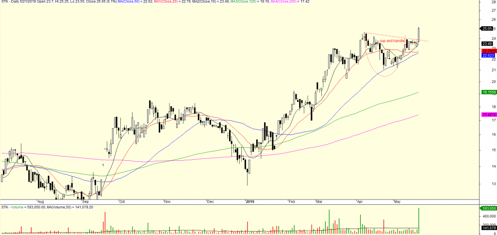 Cổ phiếu STK thiết lập điểm breakout của mẫu hình chiếc cốc-tay cầm. Đây là nền giá số 2. Anh/chị có thể xem lại bài phân tích CANSLIM về cổ phiếu STK tại đây.