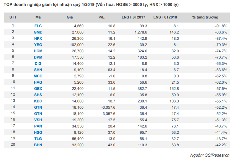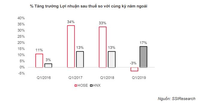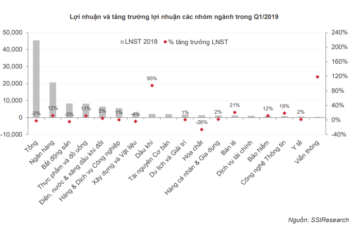 Tổng lợi nhuận ròng trong cả quý 1.2019 của các doanh nghiệp công bố là 66,418 tỷ đồng, tăng nhẹ 1.96% so với cùng kỳ năm ngoái. Nguyên nhân dẫn đến mức tăng trưởng sụt giảm so với cùng kỳ các năm trước do sự sụt giảm lợi nhuận mạnh đặc biệt ở các nhóm ngành chiếm tỷ trọng lớn như ngân hàng, bất động sản, thực phẩm và đồ uống.