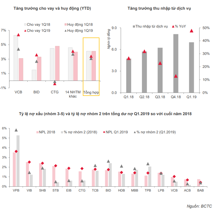 Ngành ngân hàng chỉ ghi nhận tăng trưởng 12% so với con số tăng trưởng 51% của cùng kỳ năm ngoái. Tổng thu nhập hoạt động là 67,898 tỷ đồng, +10% YoY trong đó thu nhập từ lãi, dịch vụ, ngoại hối và vàng tăng lần lượt là 16.4%, 47.8%, 41.7% YoY trong khi các khoản thu nhập từ chứng khoán, góp vốn, khác đều giảm mạnh. Thu nhập từ lãi vẫn chiếm tỷ trọng lớn (79%) trong tổng thu nhập. Tổng lợi nhuận sau thuế Q1/2019 là 20,691 tỷ đồng, +12.1% YoY.