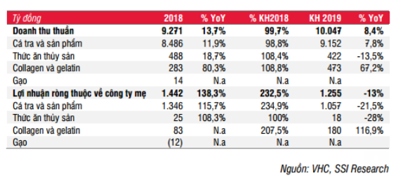 Theo Nghị quyết ĐHCĐ của VHC AGM vào ngày 26/04/2019, VHC đặt kế hoạch doanh thu thuần đạt 10 nghìn tỷ đồng (+ 8.4% YoY). Công ty kỳ vọng giá bán trung bình cá tra sẽ điều chỉnh vào năm 2019, sau một năm đầy biến động do thiếu hụt nguồn nguyên liệu trong giai đoạn 2017 – 2018. Sản lượng tiêu thụ ước tính tăng 20% YoY vào năm 2019. Dựa trên ước tính của chúng tôi, công ty sẽ có thể tăng công suất lên 28% trong giai đoạn 2018 – 2020 nhờ đầu tư mới vào nhà máy Thanh Bình Đồng Tháp và công ty mới mua lại là Vĩnh Phước Food (VPF). Nhờ vào diện tích canh tác mua thêm vào năm 2018 (220 ha), công ty dự kiến sẽ tự cung cấp khoảng 70% tổng nhu cầu nguyên liệu cá tra để chế biến vào cuối năm 2020, tăng từ 50% trong năm 2018. VHC sẽ tập trung vào việc mở rộng sang thị trường EU, Trung Quốc và các nước khác ở Nam Mỹ và Trung Đông. Trung Quốc là thị trường tiềm năng với tăng trưởng 29.3% YoY trong năm 2018 về giá trị xuất khẩu cá tra Việt Nam và chiếm 23.7% thị phần, chỉ sau thị trường Mỹ. Kim ngạch xuất khẩu sang Trung Quốc tăng trưởng mạnh mẽ trong giai đoạn 2014 – 2018 với tốc độ CAGR là 47%, nhờ (i) nhu cầu mạnh về cá tra vì giá ở mức thấp cạnh tranh so với các sản phẩm cá thịt trắng khác nhập khẩu vào Trung Quốc (ví dụ Cá minh thái Alaska , cá rô phi, cá tuyết, Cá tuyết chấm đen ) và (ii) Chính phủ Trung Quốc khuyến khích nhập khẩu các sản phẩm thủy sản để đảm bảo sự phát triển ngành thủy sản trong nước một cách bền vững (bao gồm cả nghề đánh bắt tự nhiên). Năm 2018, kim ngạch xuất khẩu từ thị trường Trung Quốc tăng 26% YoY và chiếm 11% giá trị xuất khẩu của VHC.