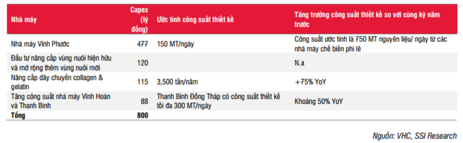 Sau 2 năm đầu tư vào thu mua diện tích canh tác mới trong năm 2017 và 2018, công ty dự định sử dụng 800 tỷ đồng CAPEX cho năm 2019, chủ yếu để nâng cấp dây chuyền sản xuất và tăng diện tích canh tác. Công ty có kế hoạch xây dựng kho lạnh mới và một cơ sở chế biến để sản xuất dầu cá và bột cá tại khu vực lân cận Nhà máy Vĩnh Phước. Vĩnh Hoàn cũng muốn tăng diện tích canh tác với khoảng 120 tỷ đồng CAPEX trong năm 2019. CAPEX 2019 sẽ đến từ vốn vay ngân hàng vì VHC có tỷ lệ D/E tương đối thấp (2018: 0.32x) và lợi nhuận giữ lại.